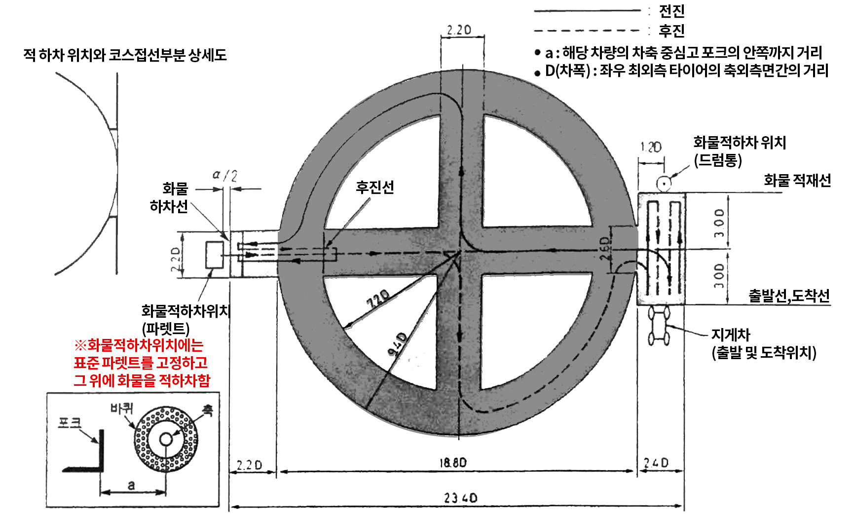 주어진 지게차를 운전하여 아래 작업 순서에 따라 도면과 같이 시험장에 설치된 코스에서 화물을 적,하차와 전, 후진 운전을 한 후 출발 전 장비 위치에 정차하시오.